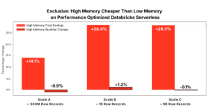 I fully expected high memory to always be more expensive. What I discovered is that when running Databricks Serverless in Performance Optimized mode, high memory is usually cheaper than low memory, sometimes dramatically so, while runtime remains nearly unchanged. As I’ll show below, across most test queries I ran, high memory was more frequently the lower-cost option for Performance Optimized Databricks Serverless, with some workloads achieving 58.1% cost reduction!