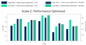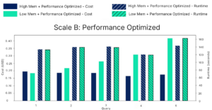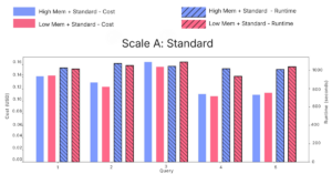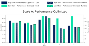 This plot shows the cost (left Y-axis) and duration (right Y-axis) and of the queries that were executed on scale A in a performance optimized mode. It’s clear that runtimes are nearly identical between high memory (blue lines) and low memory (green lines). No consistent performance advantage appears in either direction.