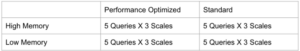 Each query was run on each scale, and with each combination on Memory (Low/High) and Serverless performance target (Standard / Performance Optimized):